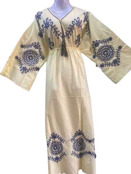 Classy and elegant Nubian style embroidered dress w/tassel. Made in Egypt out of heavy thread "Egyptian cotton."